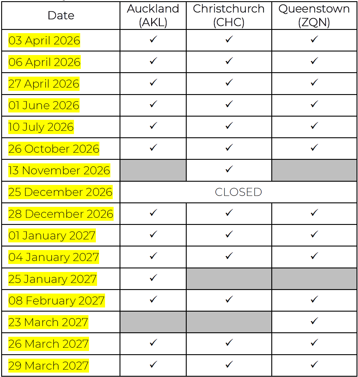 ※ 2026.04.01 부터 뉴질랜드 모든 브랜치의 공휴일 피(Holiday Surcharge)는 $ 125.00 NZD 입니다.